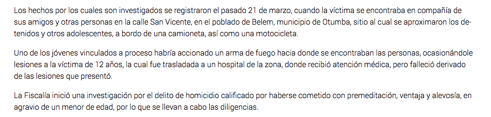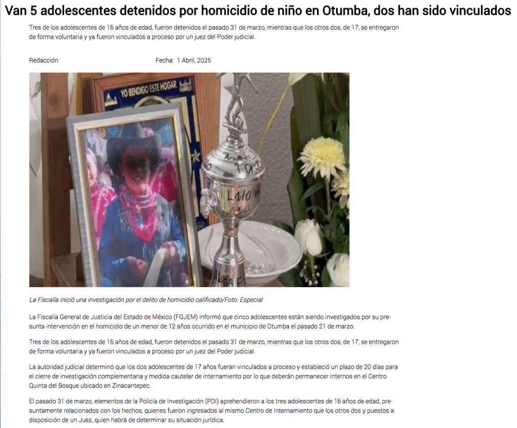 La Fiscalía General de Justicia del Estado de México (FGJEM) informó que cinco adolescentes están siendo investigados por su presunta intervención en el homicidio de un menor de 12 años ocurrido en el municipio de Otumba el pasado 21 de marzo.