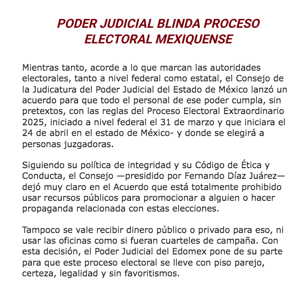 - https://a-tiempo.mx/2025/04/09/pjedomex-aprueba-acuerdo-aplicable-a-la-eleccion-de-personas-juzgadoras/?fbclid=IwY2xjawJjdEVleHRuA2FlbQIxMQABHkXD2rKEXikjcnjIH5at2m_M9qoZd1icAtVcluqV6pPCYckzKSk1kltflFDH_aem_sKv6U3uS9U24eEi_hu0p2Q