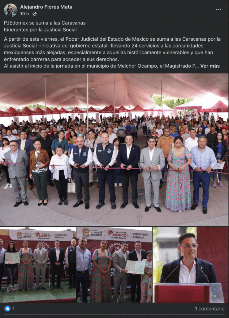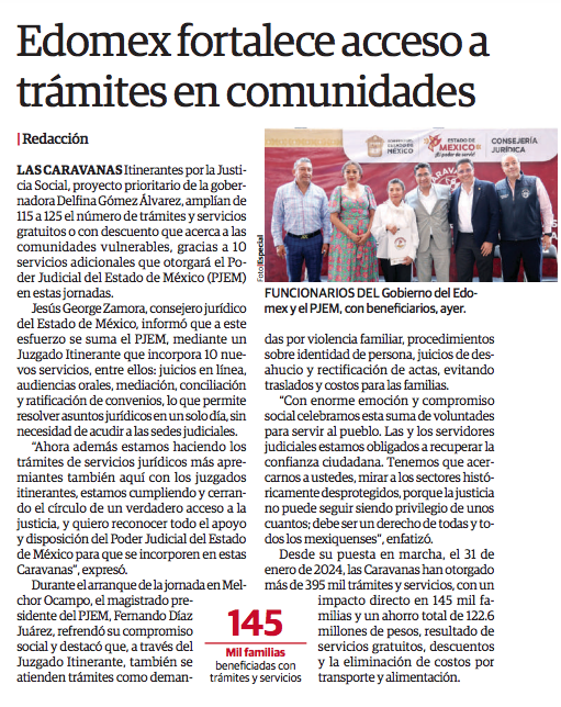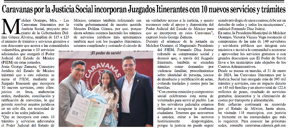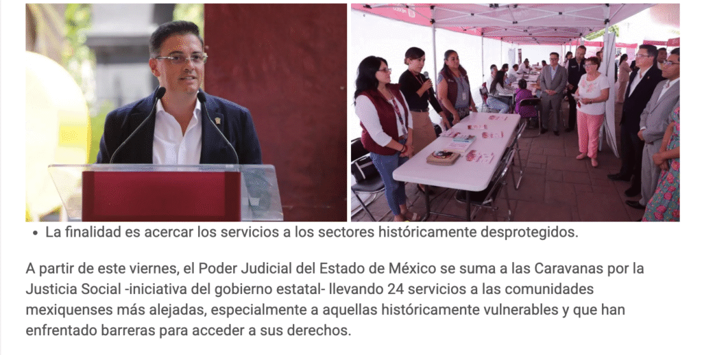 A partir de este viernes, el Poder Judicial del Estado de México se suma a las Caravanas por la Justicia Social -iniciativa del gobierno estatal- llevando 24 servicios a las comunidades mexiquenses más alejadas,especialmente a aquellas históricamente vulnerables y que han enfrentado barreras para acceder a sus derechos.