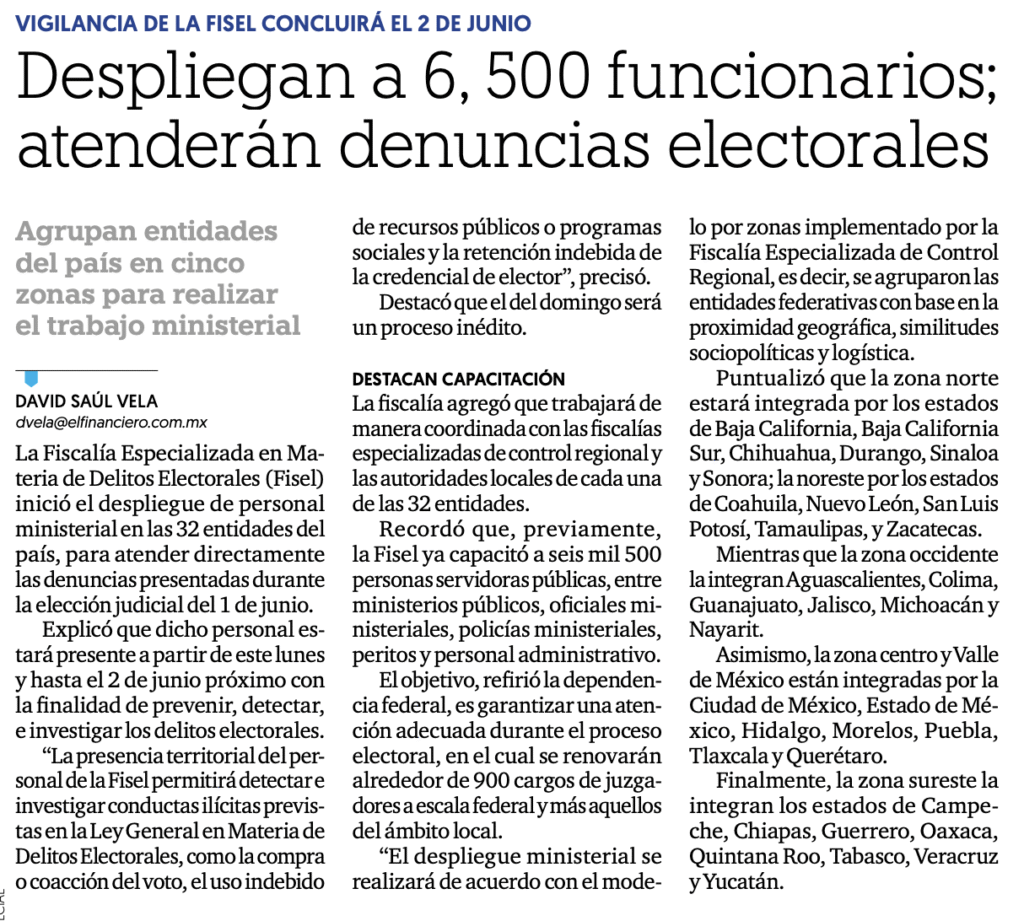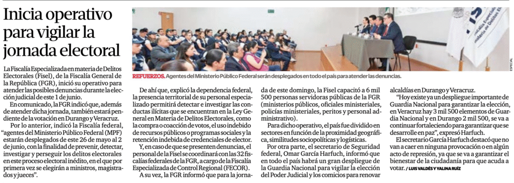 La Fiscalía Especializada en materia de Delitos Electorales (FISEL), de la Fiscalía General de la República (FGR), puso en marcha el despliegue ministerial en las 32 entidades federativas del país para la atención directa de las denuncias que pudieran presentarse durante la jornada electoral del próximo 1 de junio, cuando se renovarán 881 cargos del Poder Judicial, además de que se llevarán a cabo las elecciones en Durango y Veracruz.
