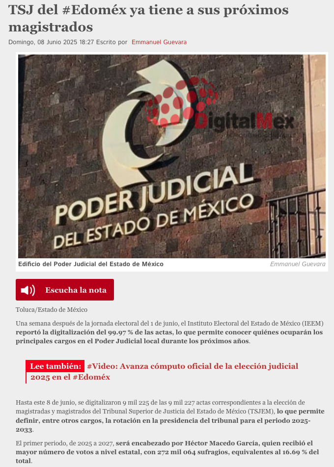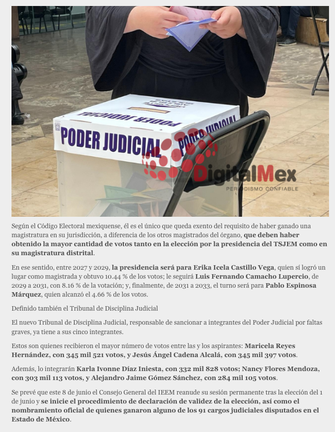 Una semana después de la jornada electoral del 1 de junio, el Instituto Electoral del Estado de México (IEEM) reportó la digitalización del 99.97 % de las actas, lo que permite conocer quiénes ocuparán los principales cargos en el Poder Judicial local durante los próximos años.