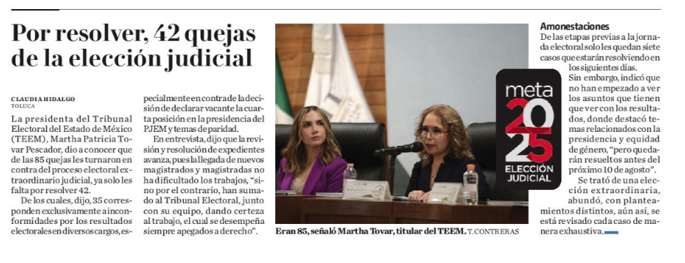 La presidenta del TEEM, Martha Patricia Tovar Pescador, dio a conocer que de las 85 quejas les turnaron en contra del proceso electoral extraordinario judicial, ya solo les falta por resolver 42.