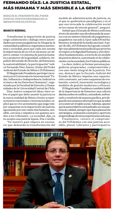 “Transformar la impartición de justicia exige colaboración y diálogo entre autoridades; personas juzgadoras; la Abogacía; la comunidad académica; organismos autónomos y sociedad, para que cada uno asuma la importancia de su rol en alcanzar un objetivo común: Un sistema de justicia humano y promotor de la igualdad, solidario, impulsor del estado de Derecho, del bienestar, la sustentabilidad y la participación” indicó Fernando Díaz Juárez, titular del Poder Judicial del Estado de México (PJEdomex).
