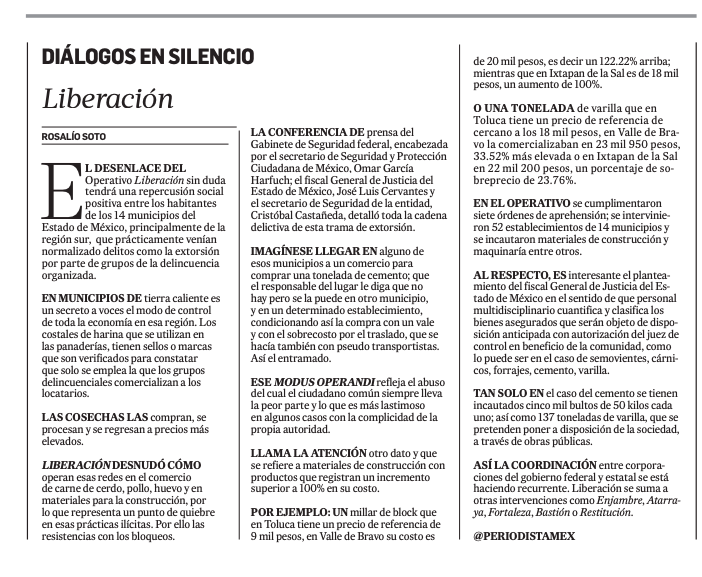 El desenlace del Operativo Liberación sin duda tendrá una repercusión social positiva entre los habitantes de los 14 municipios del Estado de México, principalmente de la región sur, que prácticamente venían normalizado delitos como la extorsión por parte de grupos de la delincuencia organizada.