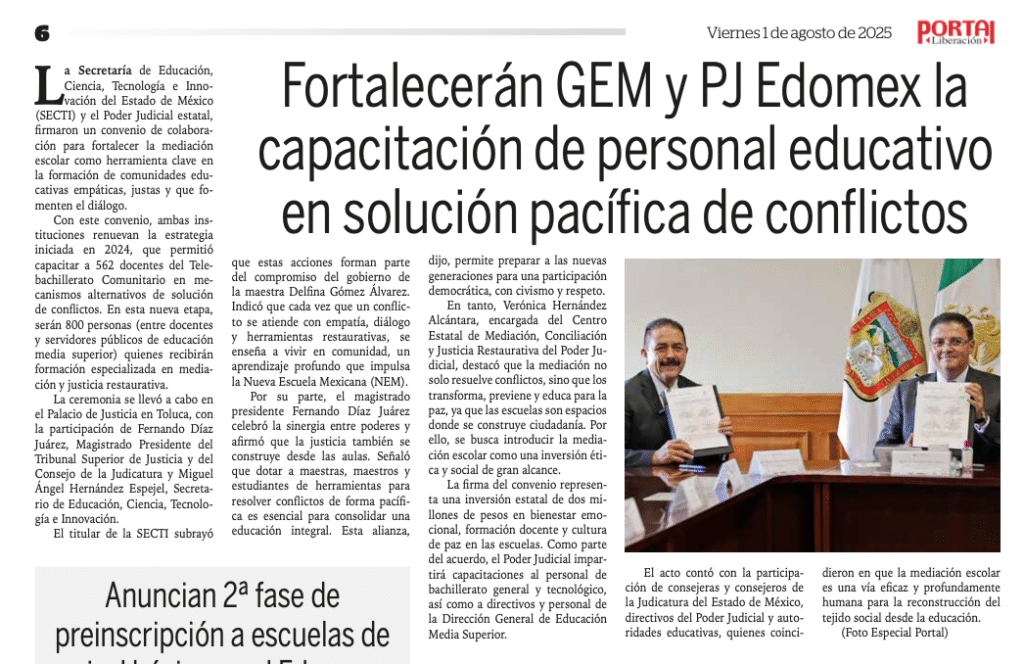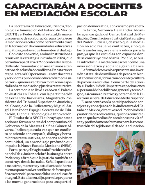 “Hoy se consolida una alianza que ubica a la educación y a la impartición de justicia como motores de la transformación social, porque en nuestras escuelas es donde se prepara a las nuevas generaciones para una participación activa en la vida democrática, con civismo, tolerancia y responsabilidad social”, expresó Fernando Díaz Juárez, titular del Poder Judicial del Estado de México (PJEdomex) al firmar un convenio de colaboración con la Secretaría de Educación, Ciencia, Tecnología e Innovación mexiquense, a fin de capacitar y certificar a 800 docentes y personal de distintos subsistemas de Educación Media Superior, como mediadores y conciliadores escolares.