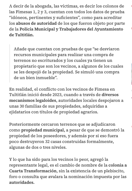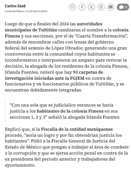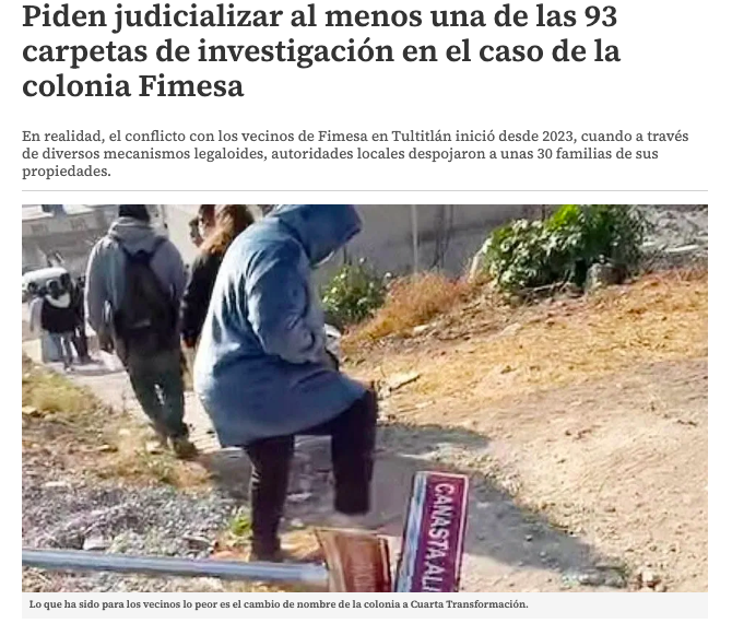 Luego de que a finales del 2024 las autoridades municipales de Tultitlán cambiaran el nombre a la colonia Fimesa y sus secciones, por el de “Cuarta Transformación”, además de renombrar calles con lemas del gobierno federal del sexenio de López Obrador, generando una gran controversia entre la comunidad cuyos habitantes se inconformaron e interpusieron un amparo para revocar la decisión, la abogada de los residentes de la colonia Fimesa, Irlanda Fuentes, reiteró que hay 93 carpetas de investigación iniciadas ante la FGJEM en contra de funcionarios y ex funcionarios públicos de Tultitlán, y se encuentran debidamente integradas.