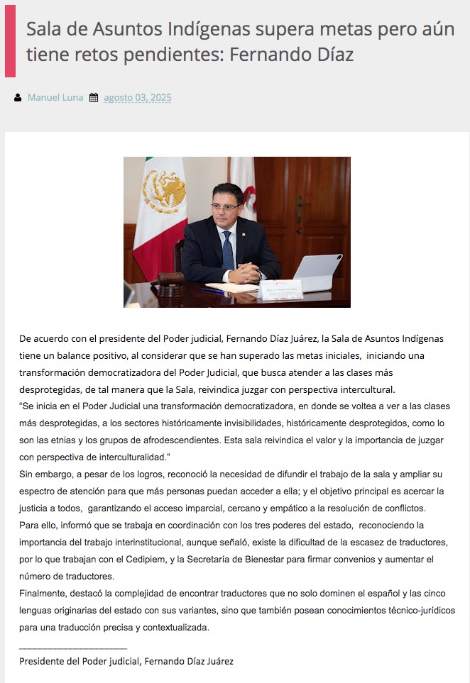 - https://asisucede.com.mx/sala-de-asuntos-indigenas-supera-metas-pero-aun-tiene-retos-pendientes-fernando-diaz/