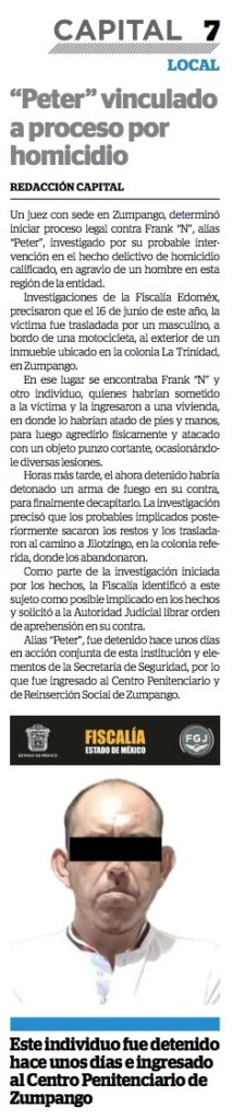 Un juez con sede en Zumpango, determinó iniciar proceso legal contra Frank “N”, alias “Peter”, investigado por su probable intervención en el hecho delictivo de homicidio calificado, en agravio de un hombre en esta región de la entidad.