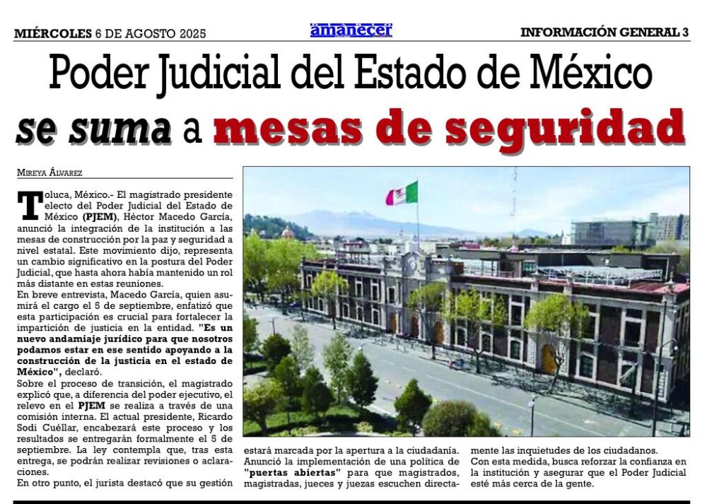 El magistrado presidente electo del Poder Judicial del Estado de México (PJEM), Héctor Macedo Garcia, anuncio la integración de la institución a las mesas de construcción por la paz y seguridad a nivel estatal. Este movimiento dijo, representa un cambio significativo en la postura del Poder Judicial, que hasta ahora habia mantenido un rol mas distante en estas reuniones.