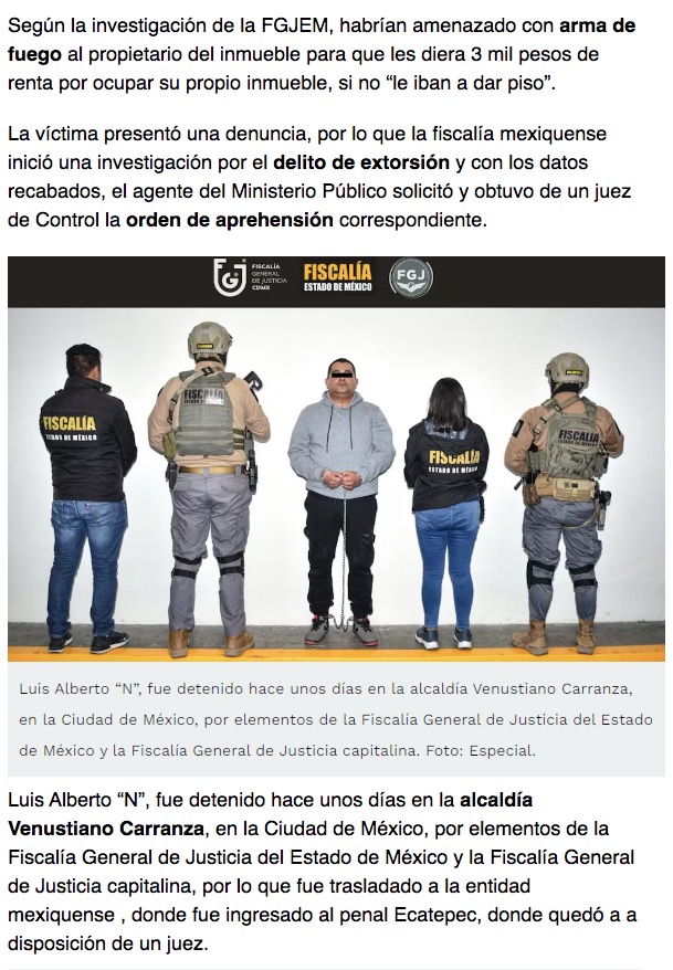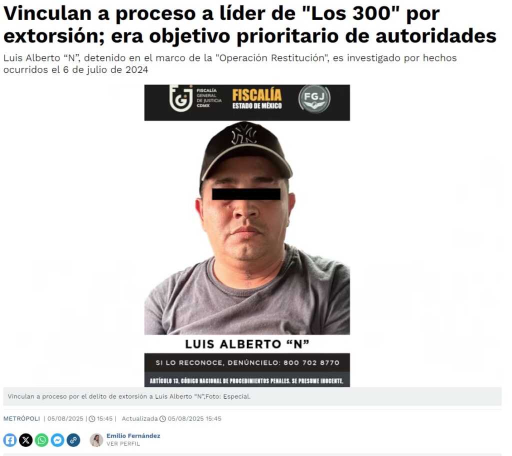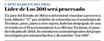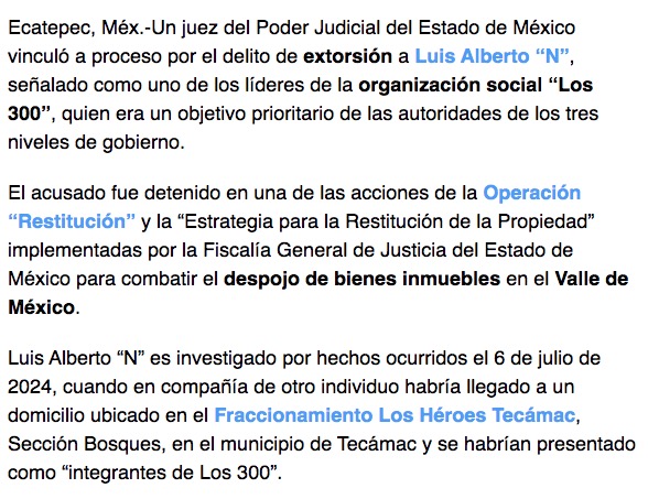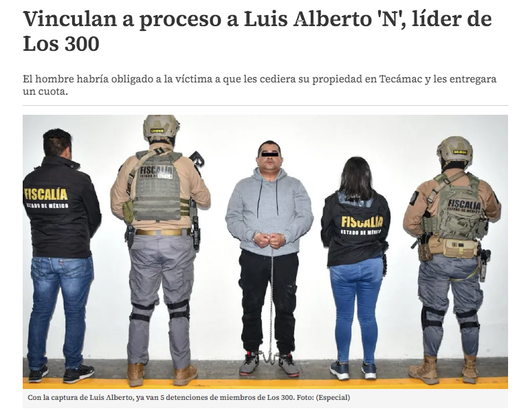 - https://www.eluniversaledomex.com.mx/seguridad/vinculado-a-proceso-lider-de-los-300-por-extorsion-en-ecatepec-cobraba-renta-a-duenos-de-casas/?fbclid=IwY2xjawMATchleHRuA2FlbQIxMQABHgKyWpOPCVS5nSPIrW_yFRQ1tREY6vOHpJuRSqRtHQYgXFdXbMVVKKWDJK9-_aem_83qzRBrA4wcmoF4lGY_bJA