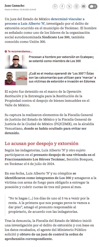 - https://www.jornada.com.mx/noticia/2025/08/05/estados/vinculan-a-proceso-a-lider-de-la-banda-los-300-dedicada-al-despojo-de-inmuebles
