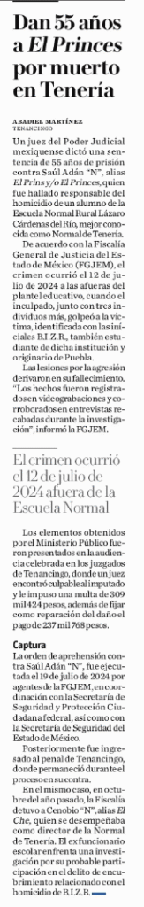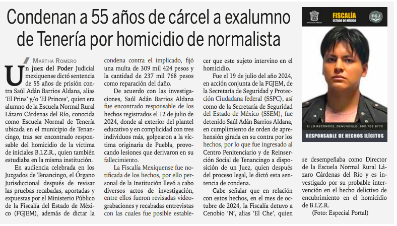 Un juez del Poder Judicial mexiquense dictó sentencia de 55 años de prisión contra Saúl Adán Barrios Aldana, alias El Prins o El Princes, quien fue hallado responsable del homicidio de un alumno de la Escuela Normal Rural Lázaro Cárdenas del Río, en Tenancingo.