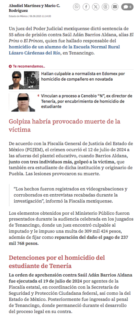 - https://www.milenio.com/policia/sentencian-ex-alumno-normal-de-teneria-por-matar-companero-novatada