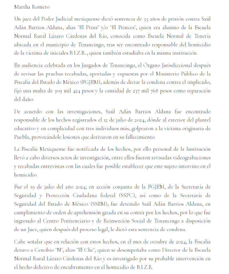 - https://www.planamayor.com.mx/condenan-a-55-anos-de-prision-a-normalista-de-teneria-que-participo-en-homicidio-de-un-companero/