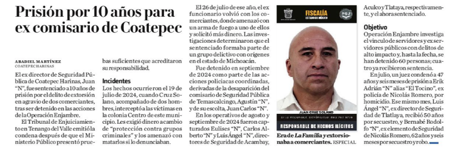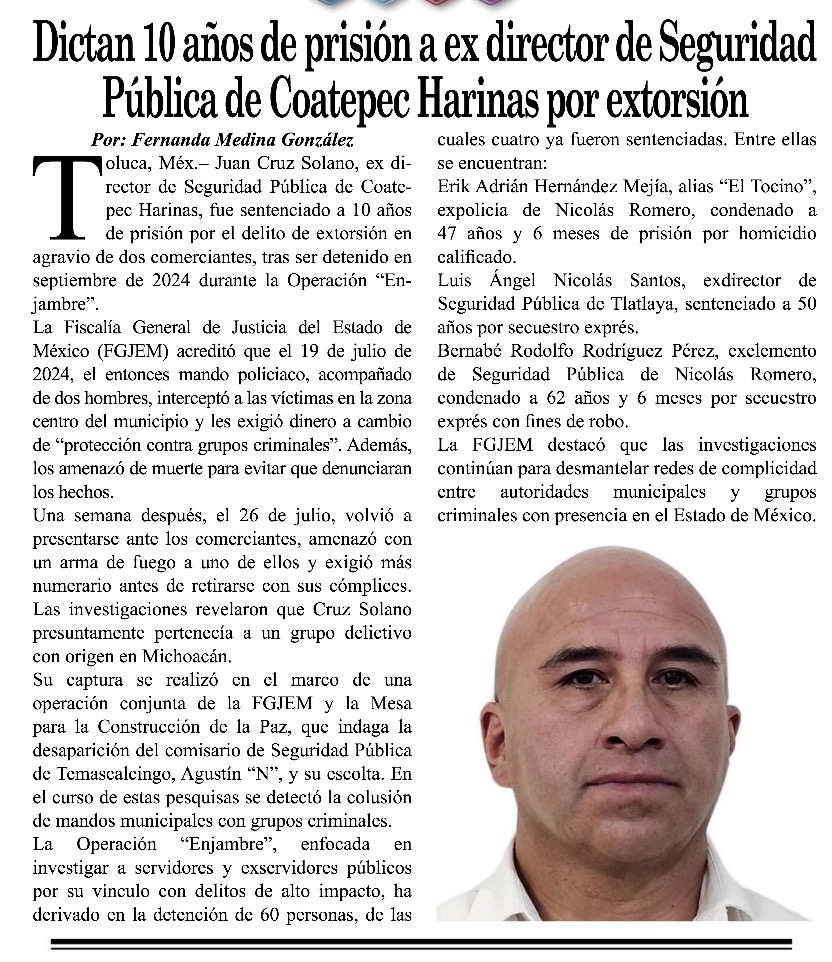 Juan Cruz Solano, quien se desempeñaba como director de Seguridad Pública de Coatepec Harinas, cuando fue detenido en la Operación “Enjambre”, fue sentenciado a 10 años de prisión, luego de que la Fiscalía General de Justicia del Estado de México (FGJEM) acreditó su responsabilidad en el delito de extorsión, en agravio de dos comerciantes.