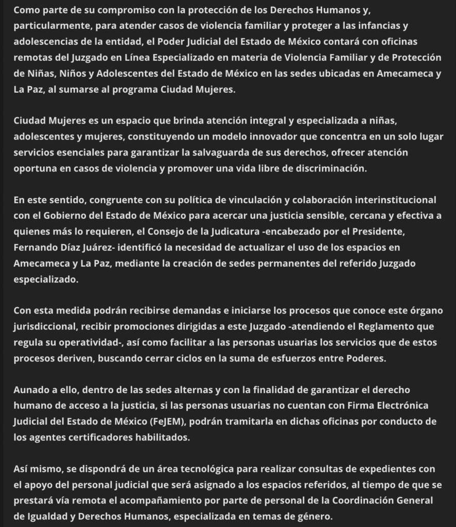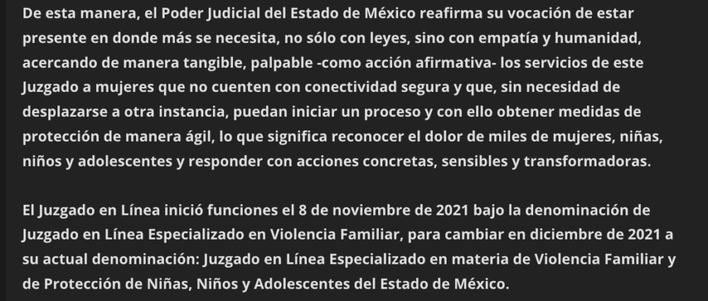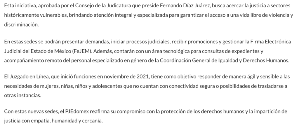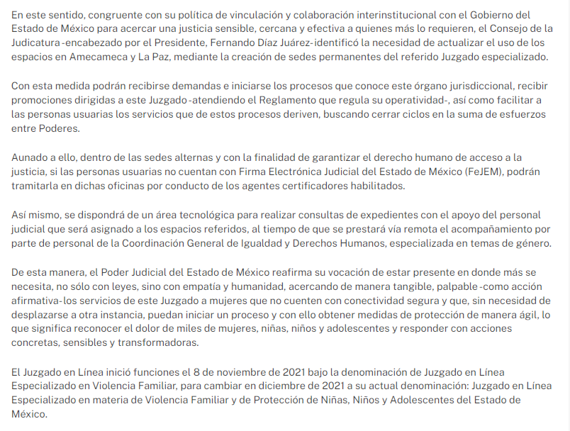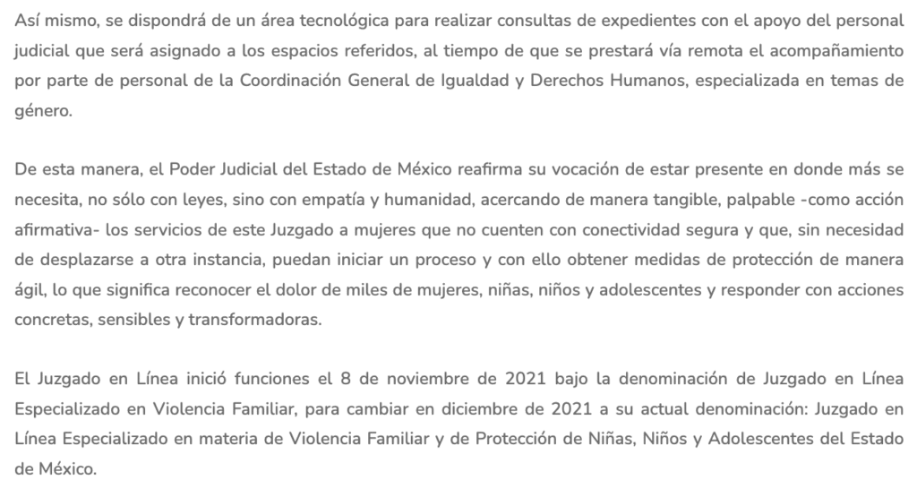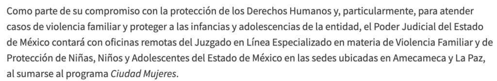 Como parte de su compromiso con la protección de los Derechos Humanos y, particularmente, para atender casos de violencia familiar y proteger a las infancias y adolescencias de la entidad, el Poder Judicial del Estado de México contará con oficinas remotas del Juzgado en Línea Especializado en materia de Violencia Familiar y de Protección de Niñas, Niños y Adolescentes del Estado de México en las sedes ubicadas en Amecameca y La Paz, al sumarse al programa Ciudad Mujeres.
