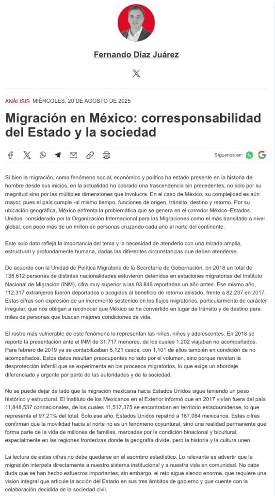Migración en México: corresponsabilidad del Estado y la sociedad – Fernando Díaz Juárez