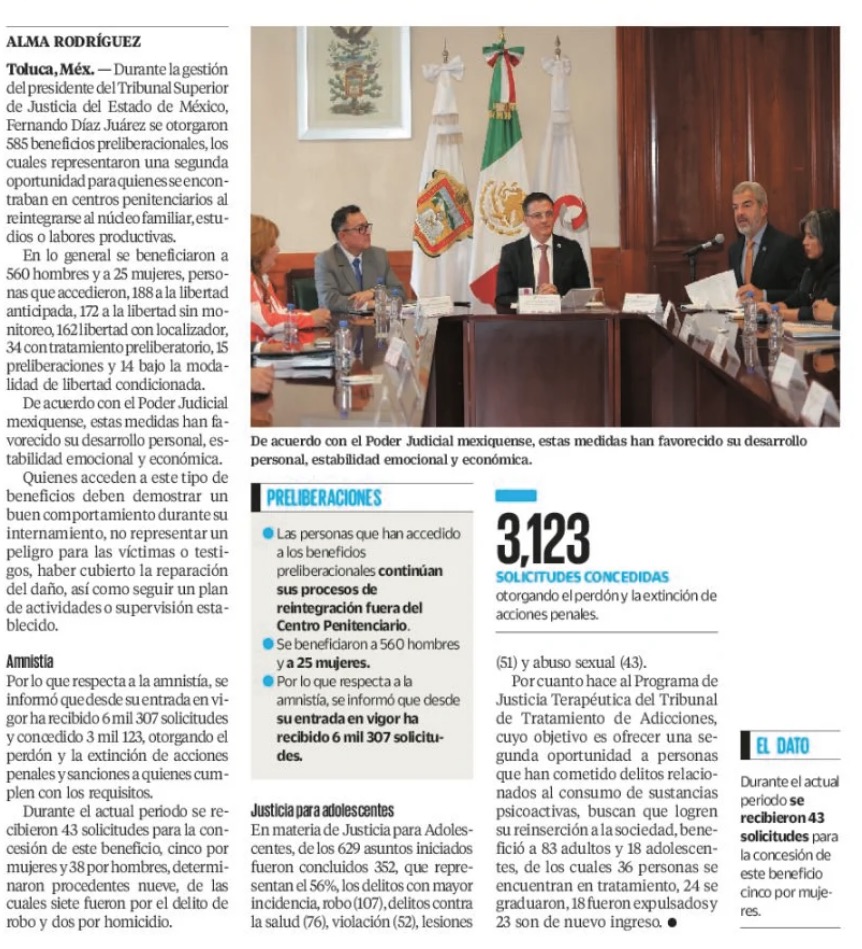 Durante la gestión del presidente del Tribunal Superior de Justicia del Estado de México, Fernando Díaz Juárez se otorgaron 585 beneficios preliberacionales, los cuales representaron una segunda oportunidad para quienes se encontraban en centros penitenciarios al reintegrarse al núcleo familiar, estudios o labores productivas.