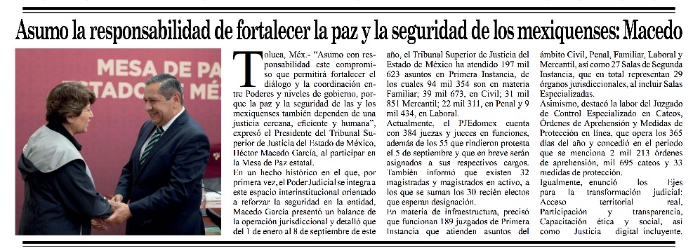Asumo con responsabilidad este compromiso que permitirá fortalecer el diálogo y la coordinación entre Poderes y niveles de gobierno, porque la paz y la seguridad de las y los mexiquenses también dependen de una justicia cercana, eficiente y humana, expresó el Presidente del Tribunal Superior de Justicia del Estado de México, Héctor Macedo García, al participar en la Mesa de Paz estatal. En un hecho histórico en el que, por primera vez, el Poder Judicial se integra a este espacio interinstitucional orientado a reforzar la seguridad en la entidad.