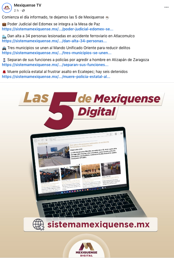 - https://www.facebook.com/MexiquenseTV/posts/pfbid0Wz31X3mGeLPHqkLfcqJ2fbYthq7rzNs1ESvtreAqHt5HL7WxJeoFBPDFTmrgd7tcl