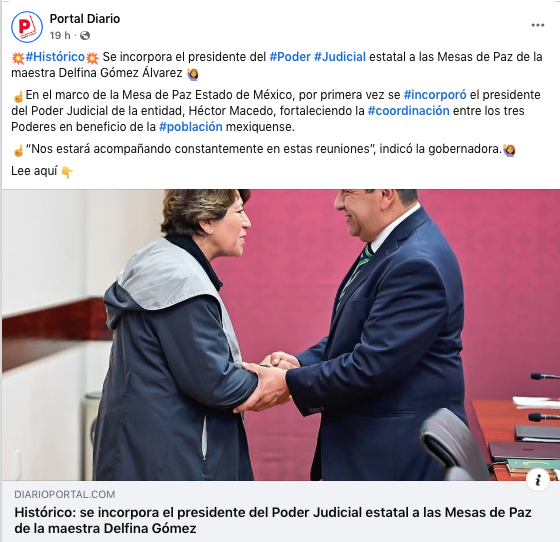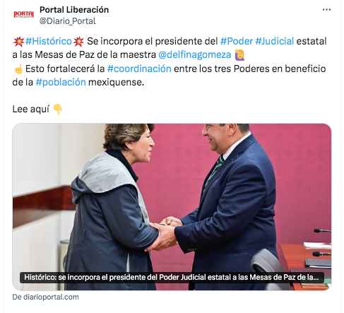 - https://diarioportal.com/seguridad-y-justicia/historico-se-incorpora-el-presidente-del-poder-judicial-estatal-a-las-mesas-de-paz-de-la-maestra-delfina-gomez