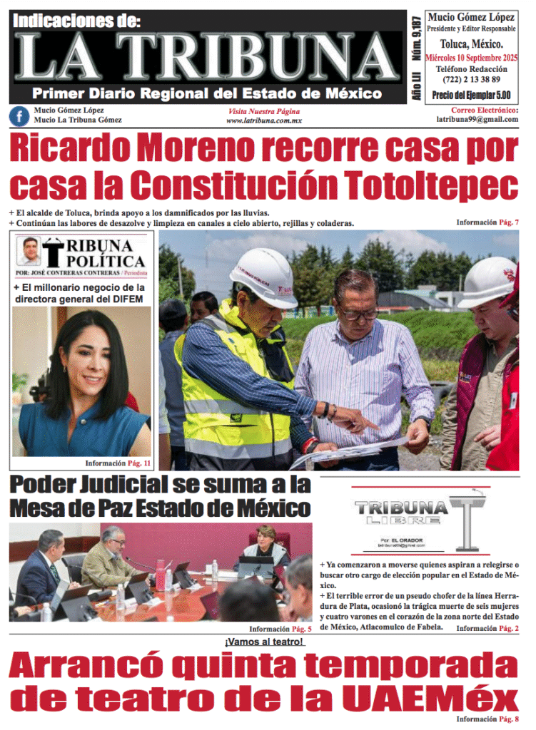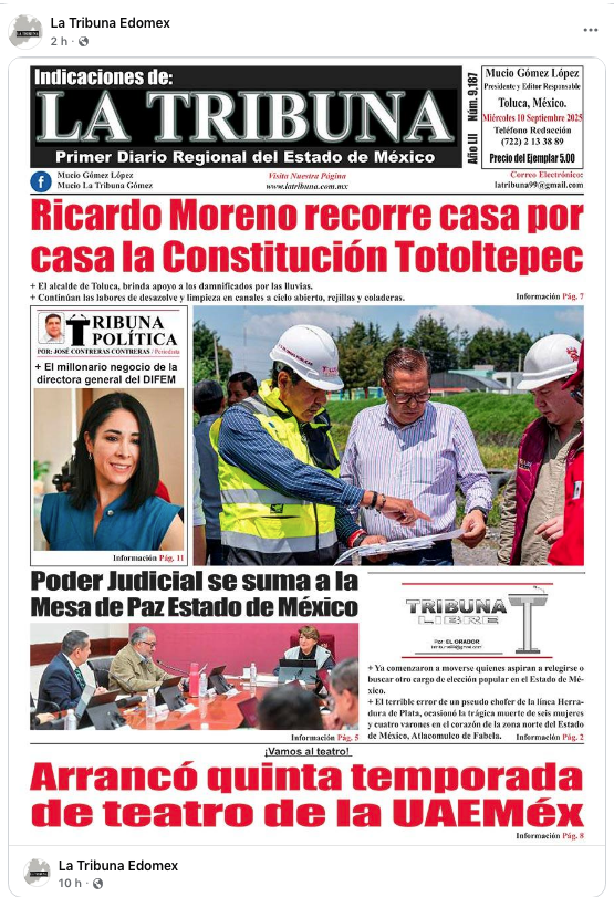 - https://www.facebook.com/LaTribunaEdoMex/posts/pfbid02aLyUMb4pMXrmzPGm3Y6fyDkJobSSubZGMhbbuUqktqLaiNAruHERKTCwbyHNPPcWl