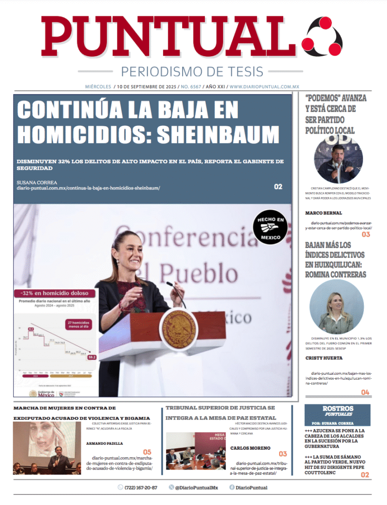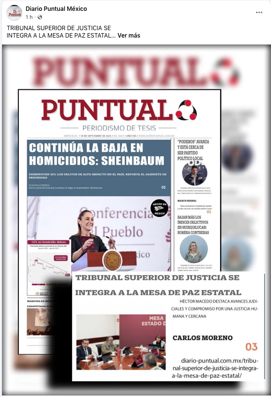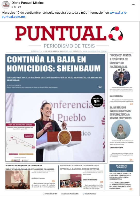 - https://www.facebook.com/DiarioPuntualMx/posts/pfbid0i1nhRWe8sd6US1tacatHSzUYARY1HvEGa3uoBHfmypQgZhUyCvXmwDudcwLVQcykl