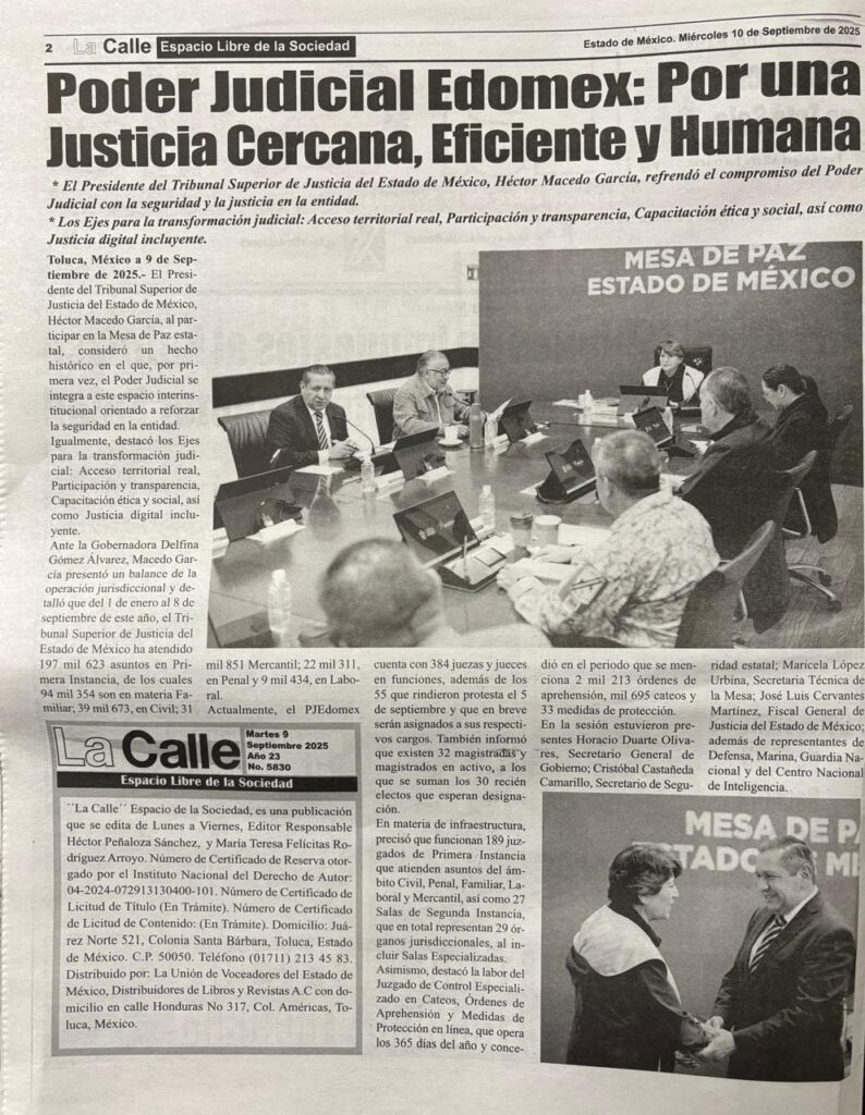 - https://lacallelibre.com.mx/2025/09/10/poder-judicial-edomex-por-una-justicia-cercana-eficiente-y-humana/?fbclid=IwY2xjawMvr4BleHRuA2FlbQIxMABicmlkETF4c3ZCZ3BDOWlnT3Z2SmhaAR6DhCusrmVLeTmTb5Tc92va3Q-F_VfvbtUHy68rz9z1Ze9mxt5wglVHxCK1Hw_aem_rJslBKVebgRMN0kIE737QA
