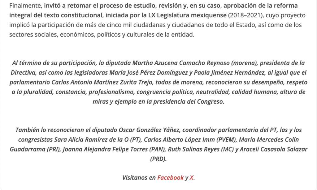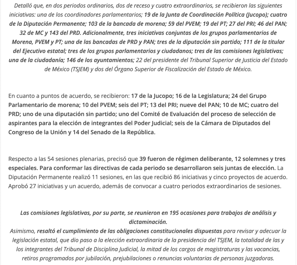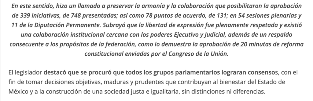 […]En este sentido, hizo un llamado a preservar la armonía y la colaboración que posibilitaron la aprobación de 339 iniciativas, de 748 presentadas; así como 78 puntos de acuerdo, de 131; en 54 sesiones plenarias y 11 de la Diputación Permanente. Subrayó que la libertad de expresión fue plenamente respetada y existió una colaboración institucional cercana con los poderes Ejecutivo y Judicial, además de un respaldo consecuente a los propósitos de la federación, como lo demuestra la aprobación de 20 minutas de reforma constitucional enviadas por el Congreso de la Unión. […]