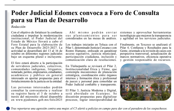 - https://www.capitaledomex.com.mx/local/convocan-a-foros-ciudadanos-para-elaborar-plan-de-desarrollo-del-poder-judicial-del-edomex-2025-2027/