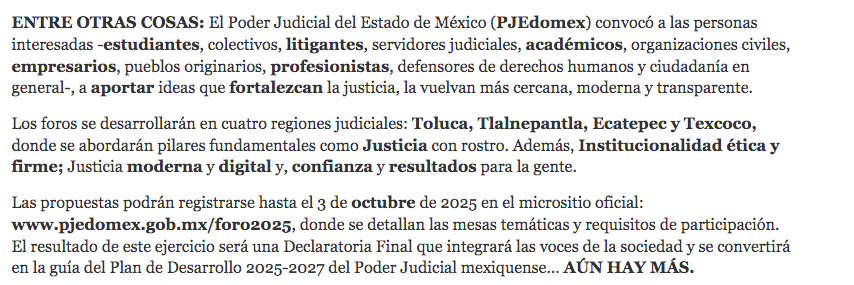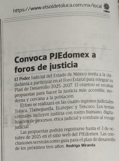 - https://lacallelibre.com.mx/2025/09/23/poder-judicial-edomex-convoca-a-foro-de-consulta-para-su-plan-del-desarrollo/?fbclid=IwY2xjawM_3qJleHRuA2FlbQIxMABicmlkETFkSXhqQWk0aXlKaFlQdUoxAR50zyLkAbWjgG25Q0UuT4dc9kbB_qtVkYyc_BLbgxes5vTvtuS6tDPVO5D0Sg_aem_hhfK71x4rA8-YXljmrKShw