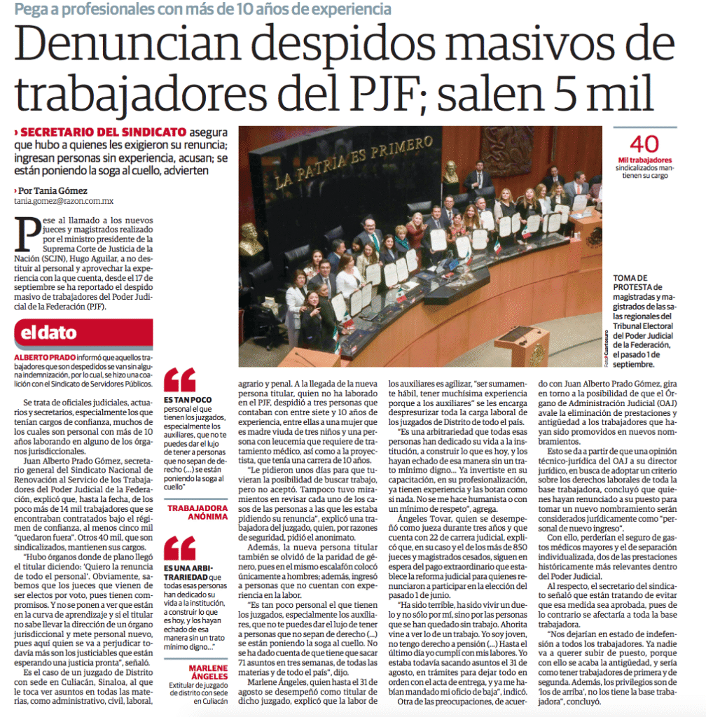 Suprema Corte de Justicia de la Nación (SCJN), Hugo Aguilar, a no destituir al personal y aprovechar la experiencia con la que cuenta, desde el 17 de septiembre se ha reportado el despido masivo de trabajadores del Poder Judicial de la Federación (PJF).