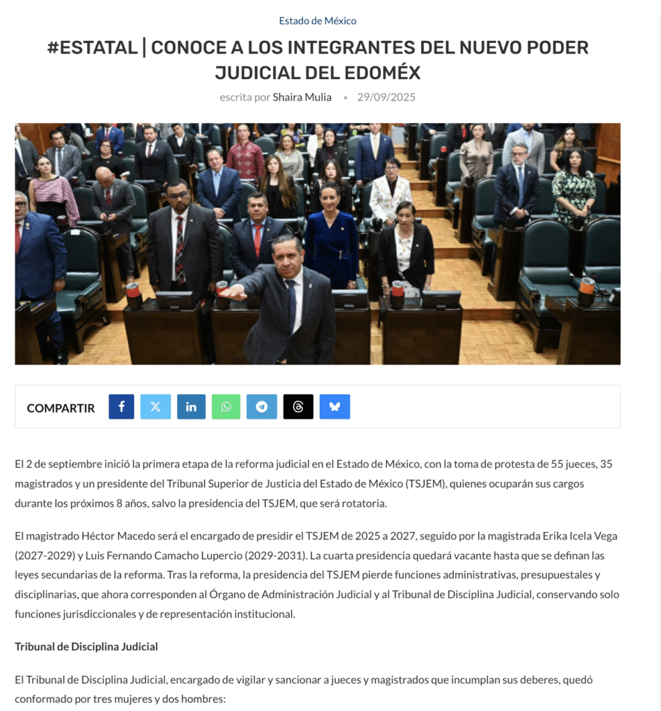 El 2 de septiembre inició la primera etapa de la reforma judicial en el Estado de México, con la toma de protesta de 55 jueces, 35 magistrados y un presidente del Tribunal Superior de Justicia del Estado de México (TSJEM), quienes ocuparán sus cargos durante los próximos 8 años, salvo la presidencia del TSJEM, que será rotatoria.