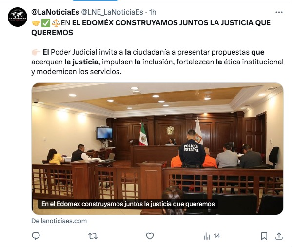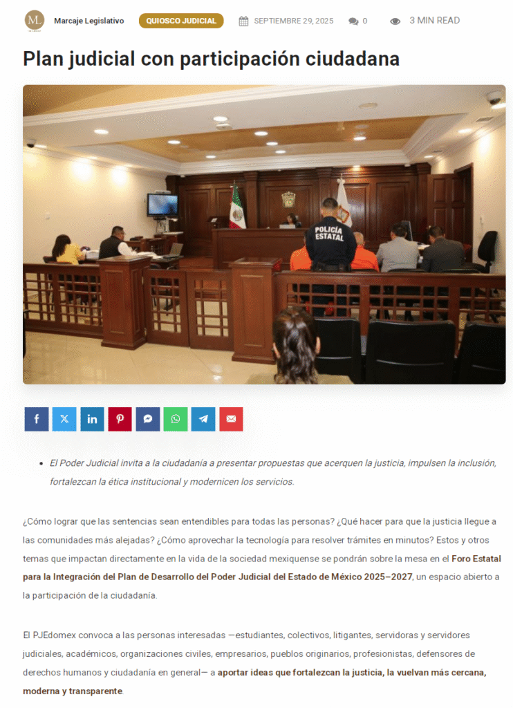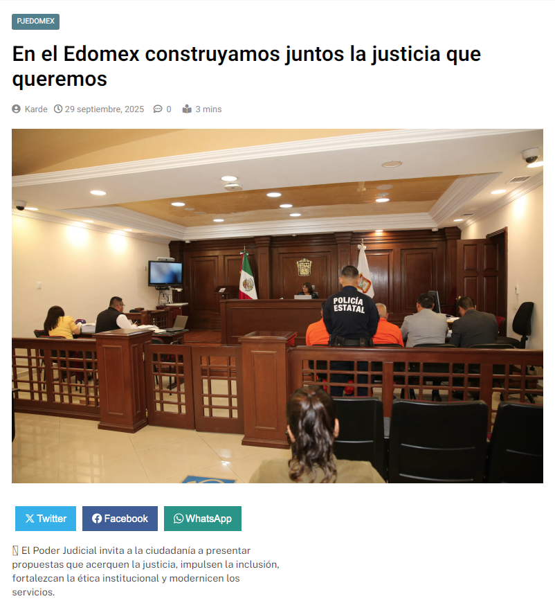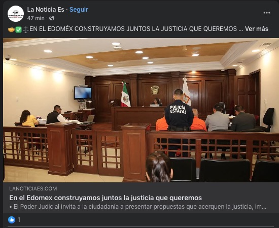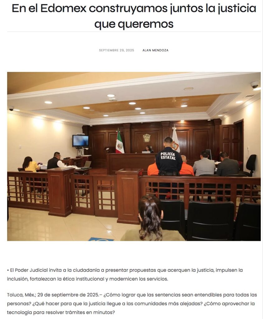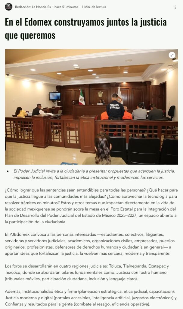 - https://www.lanoticiaes.com/post/en-el-edomex-construyamos-juntos-la-justicia-que-queremos?fbclid=IwY2xjawNIt49leHRuA2FlbQIxMQBicmlkETFncUxUVnpsWDQ3ZnpKSWVGAR7wt0FKxPug79NEX_63iPMfB27LiZ1kna57HpIH9MNAnZhg9dLGIZAj5zBd4g_aem_OyeURRTnWX7om7mXZXDA6w