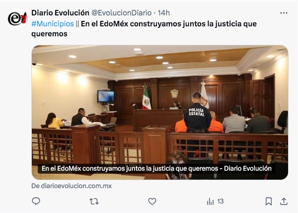 - https://www.diarioevolucion.com.mx/en-el-edomex-construyamos-juntos-la-justicia-que-queremos/?fbclid=IwY2xjawNIuB5leHRuA2FlbQIxMQBicmlkETFncUxUVnpsWDQ3ZnpKSWVGAR6rqBfMpUNOYsm4Hj_oWHyi0rPuiqP53ybc1dUvkNZHGZNbvEPl7DvE_mcn-w_aem_BfQYdZeFBtOgvZ1hAB_1Ow
