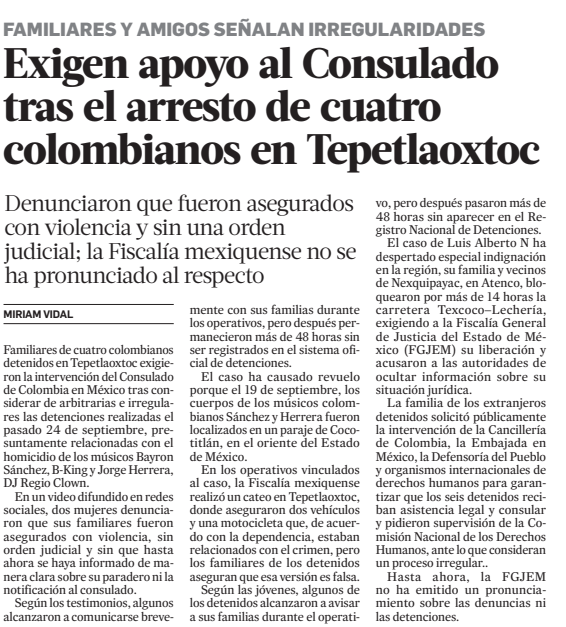 Familiares de cuatro colombianos detenidos en Tepetlaoxtoc exigieron la intervención del Consulado de Colombia en México tras considerar de arbitrarias e irregulares las detenciones realizadas el pasado 24 de septiembre, presuntamente relacionadas con el homicidio de los músicos.