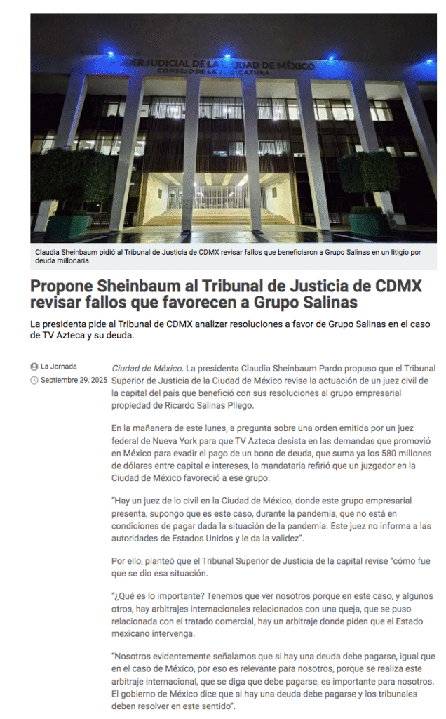 - https://lajornadaestadodemexico.com/propone-sheinbaum-al-tribunal-de-justicia-de-cdmx-revisar-fallos-que-favorecen-a-grupo-salinas/