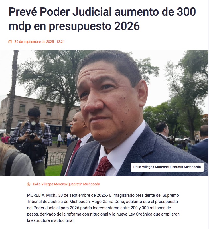 El magistrado presidente del Supremo Tribunal de Justicia de Michoacán, Hugo Gama Coria, adelantó que el presupuesto del Poder Judicial para 2026 podría incrementarse entre 200 y 300 millones de pesos, derivado de la reforma constitucional y la nueva Ley Orgánica que ampliaron la estructura institucional.