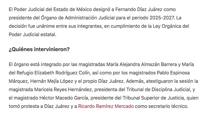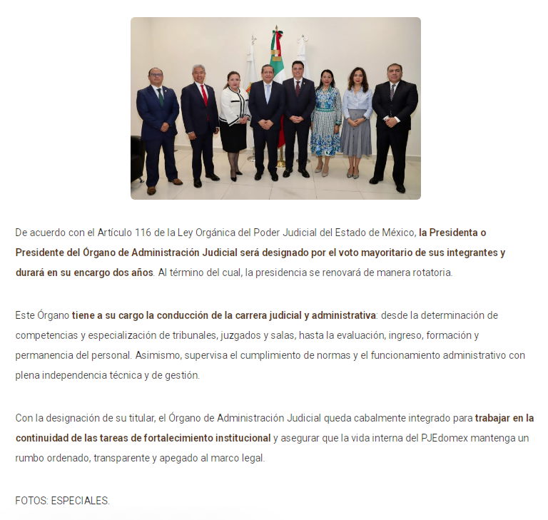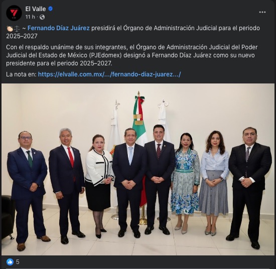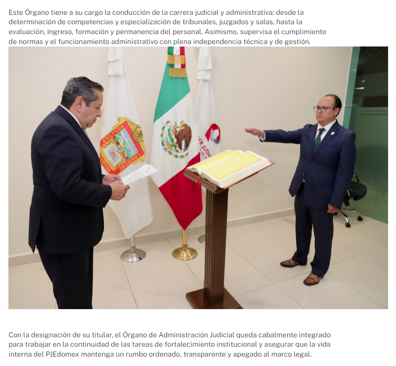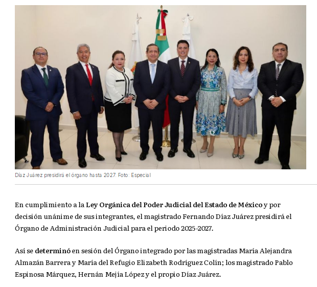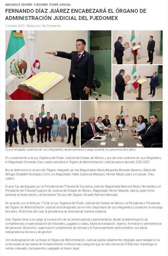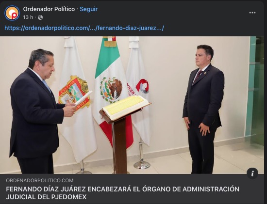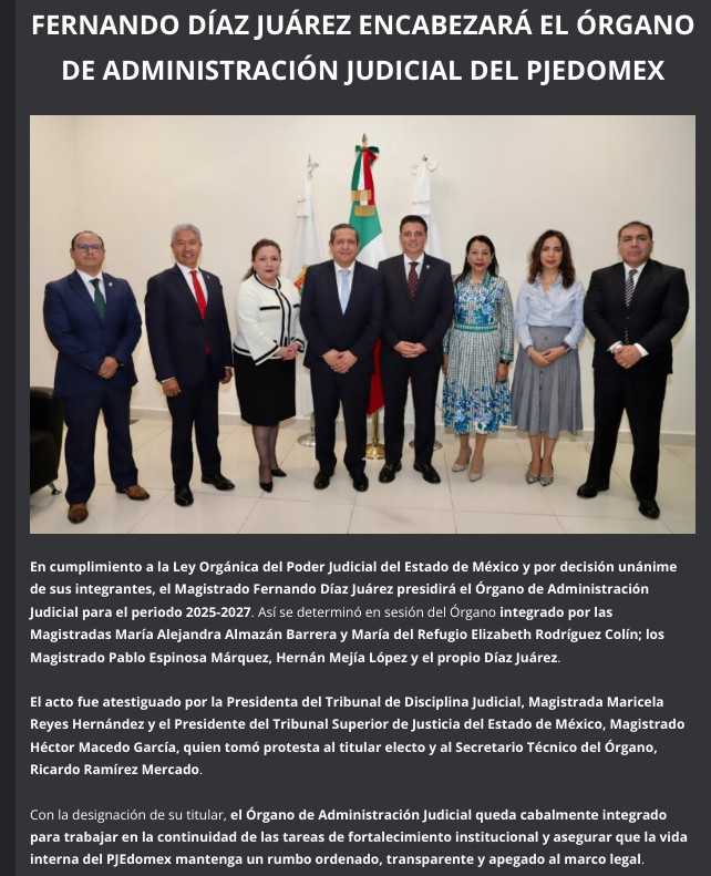 - https://ordenadorpolitico.com/2025/10/01/fernando-diaz-juarez-encabezara-el-organo-de-administracion-judicial-del-pjedomex/?fbclid=IwY2xjawNLUolleHRuA2FlbQIxMQBicmlkETFhRG5EOEJKbzIzMkNLRUliAR7-9PHaXzFQnJP_IeYWMjiDlLEGzpUSZ73mTFRPhVn2KagpwtuLuVP-RGrtAw_aem_L4yT7g1y6Lo8ZmrVfTiX3A