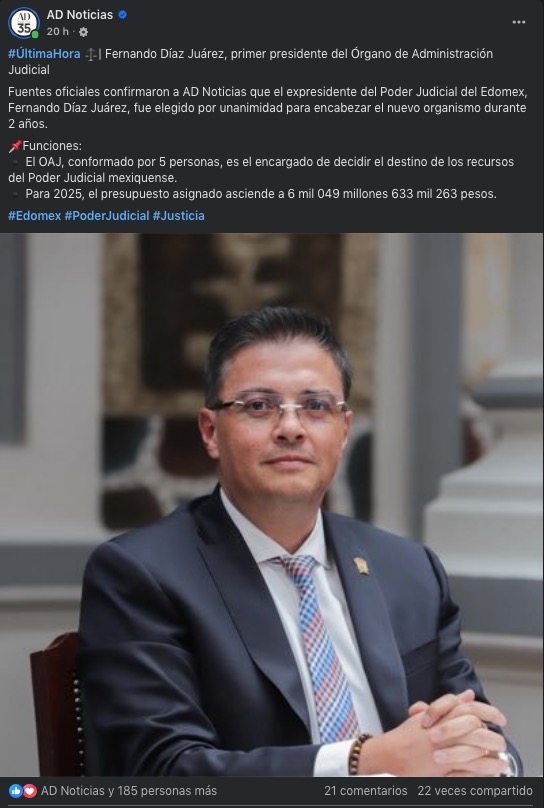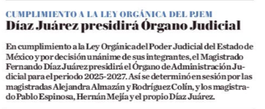 - https://www.diarioevolucion.com.mx/fernando-diaz-juarez-encabezara-el-organo-de-administracion-judicial-del-pjedomex/?fbclid=IwY2xjawNLUOdleHRuA2FlbQIxMQABHpGMi0foPfLHF7NqIWTuI-91eOYTyl72yqAbNESGLBMhW2BOxivqkVA9vsZk_aem_4BBGR8sMEH4tIA75MLglcg