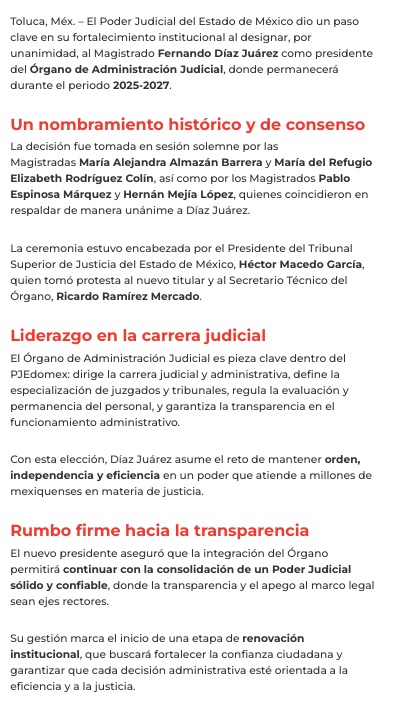 - https://primeroeditores.com.mx/estado/fernando-diaz-juarez-nuevo-presidente-del-organo-de-administracion-judicial-del-pjedomex/?fbclid=IwY2xjawNLUr9leHRuA2FlbQIxMABicmlkETFhRG5EOEJKbzIzMkNLRUliAR5ZTKc_CbYTUZll_jAfUz6dYFBs-2Q2eCpOJJ1sKxHoTGxO5t_xwMkGD3yUTQ_aem_LoxP12Dta9yEhl3Ww7uQaA
