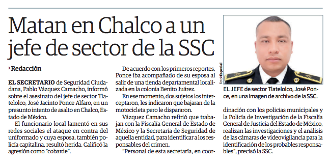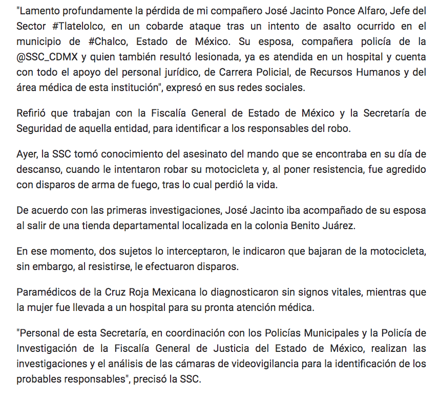 El Jefe de Sector en Tlatelolco de la Secretaría de Seguridad Ciudadana (SSC), José Jacinto Ponce Alfaro, fue asesinado en medio de un asalto en el municipio de Chalco, Estado de México, la noche del martes, por lo que el secretario de Seguridad Ciudadana (SSC), Pablo Vázquez, lamentó el deceso del mando.