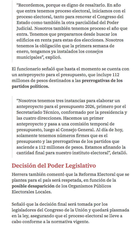 Para el año 2026 se iniciarán los preparativos de las elecciones del 2027, que incluirán la renovación del Congreso del Estado y de una parte del Poder Judicial, informó Roberto Herrera, presidente del Instituto Electoral y de Participación Ciudadana, quien señaló que se buscará contar con el presupuesto adecuado para estos procesos.