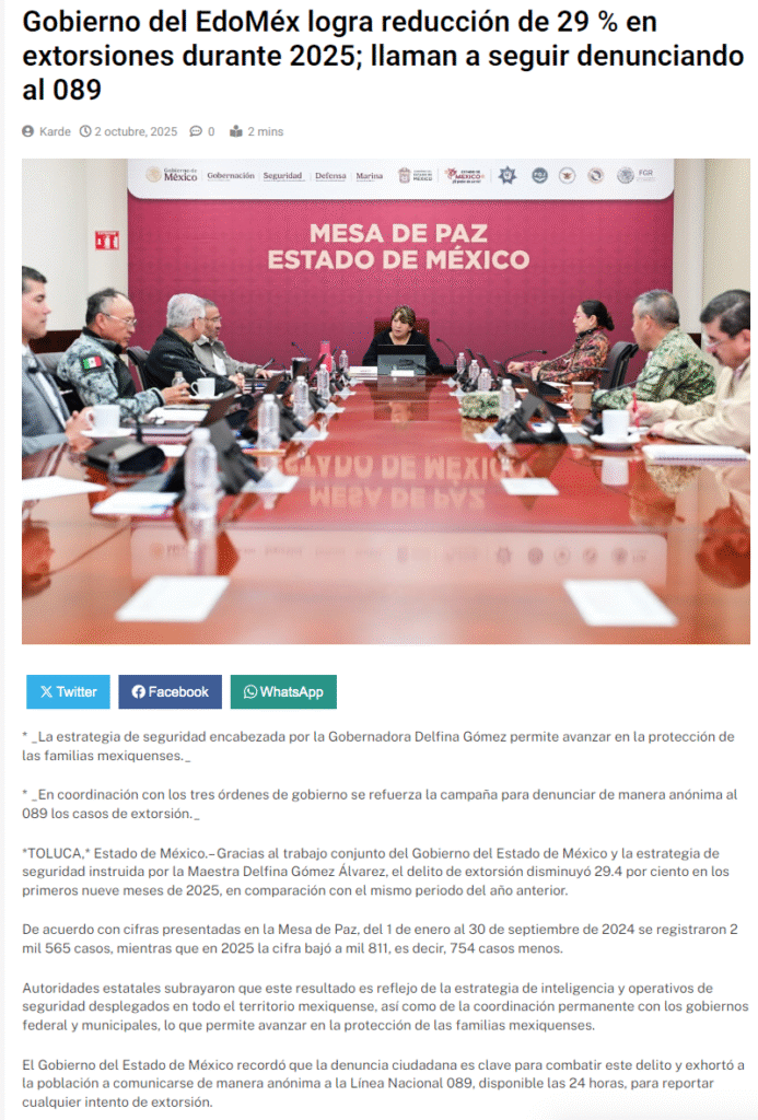 • https://cadenapolitica.com/2025/10/02/gobierno-del-edomex-logra-reduccion-de-29-en-extorsiones-durante-2025-llaman-a-seguir-denunciando-al-089/