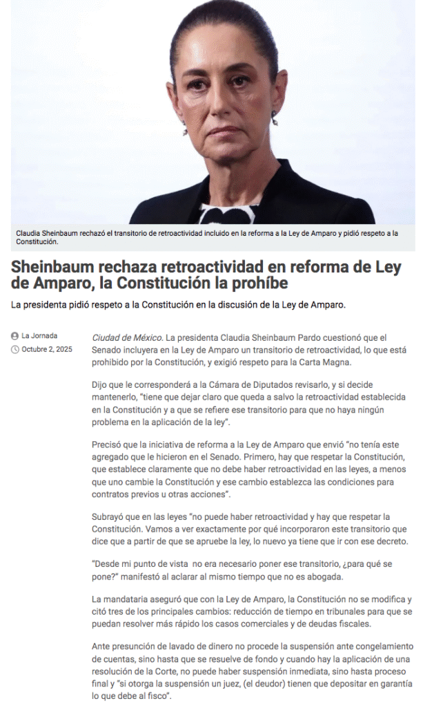 La presidenta Claudia Sheinbaum Pardo cuestionó que el Senado incluyera en la Ley de Amparo un transitorio de retroactividad, lo que está prohibido por la Constitución, y exigió respeto para la Carta Magna.