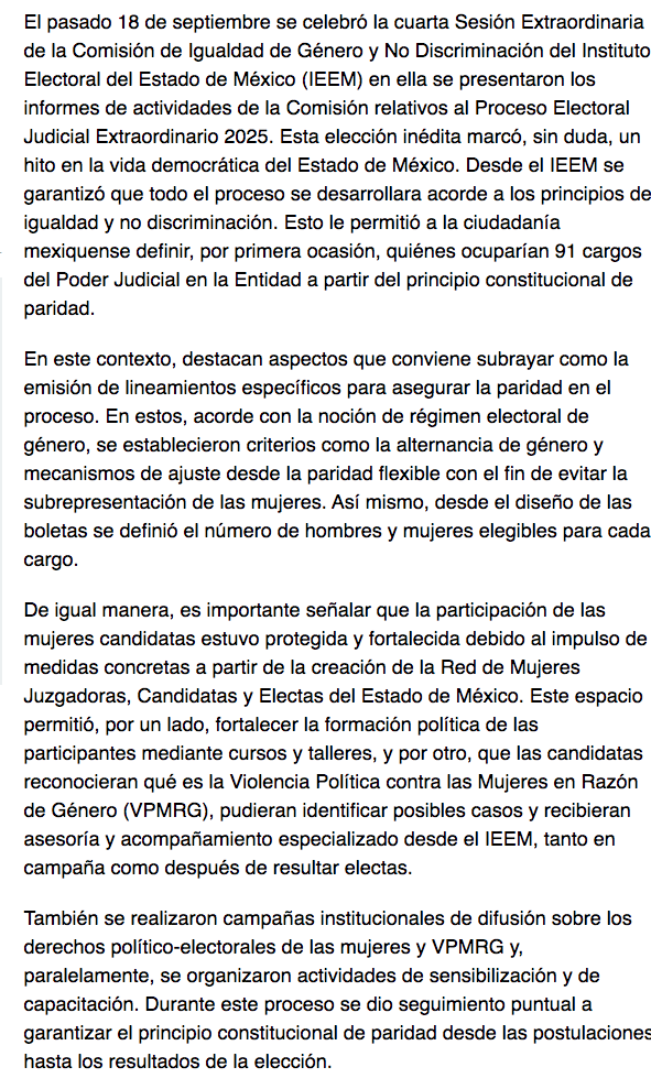 El pasado 18 de septiembre se celebró la cuarta Sesión Extraordinaria de la Comisión de Igualdad de Género y No Discriminación del Instituto Electoral del Estado de México (IEEM) en ella se presentaron los informes de actividades de la Comisión relativos al Proceso Electoral Judicial Extraordinario 2025. Esta elección inédita marcó, sin duda, un hito en la vida democrática del Estado de México. Desde el IEEM se garantizó que todo el proceso se desarrollara acorde a los principios de igualdad y no discriminación. Esto le permitió a la ciudadanía mexiquense definir, por primera ocasión, quiénes ocuparían 91 cargos del Poder Judicial en la Entidad a partir del principio constitucional de paridad.