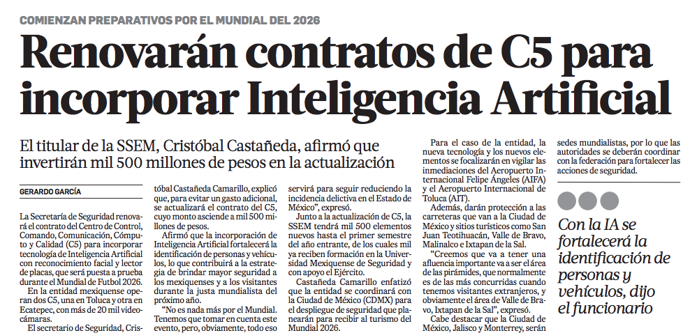 La Secretaría de Seguridad renovará el contrato del Centro de Control, Comando, Comunicación, Cómputo y Calidad (C5) para que se incluya Inteligencia Artificial (IA) para el reconocimiento de rostros y lector de placas, tecnología que se pondrá aprueba en la celebración del Mundial de Futbol 2026.