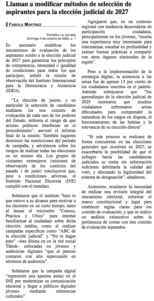Es necesario modificar los mecanismos de evaluación de los aspirantes rumbo a la elección judicial de 2027 para garantizar los principios de competencia, idoneidad e igualdad de condiciones para todos los que participen, señaló la misión de observación del Instituto Internacional para la Democracia y Asistencia (IDEA).