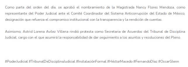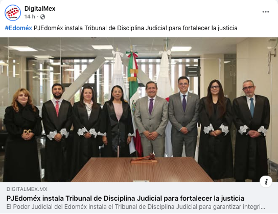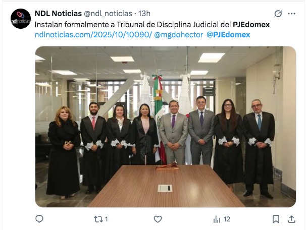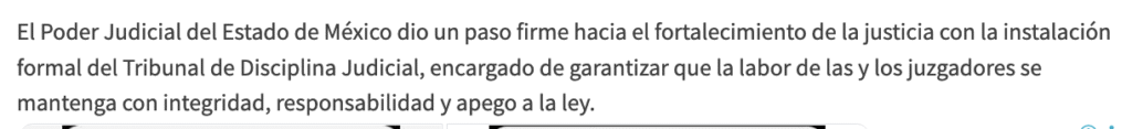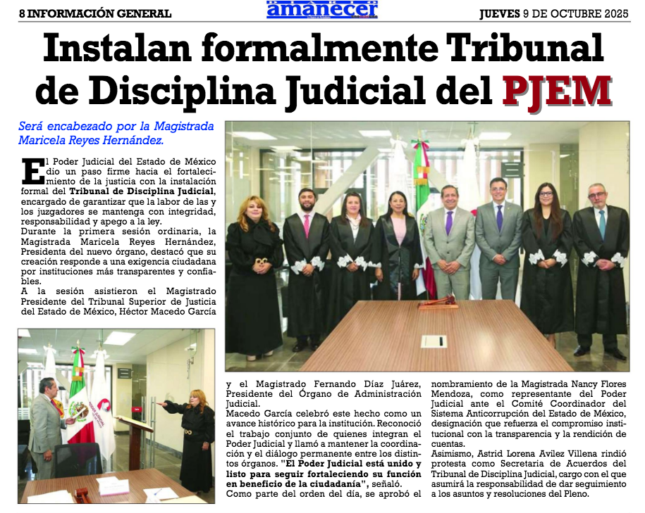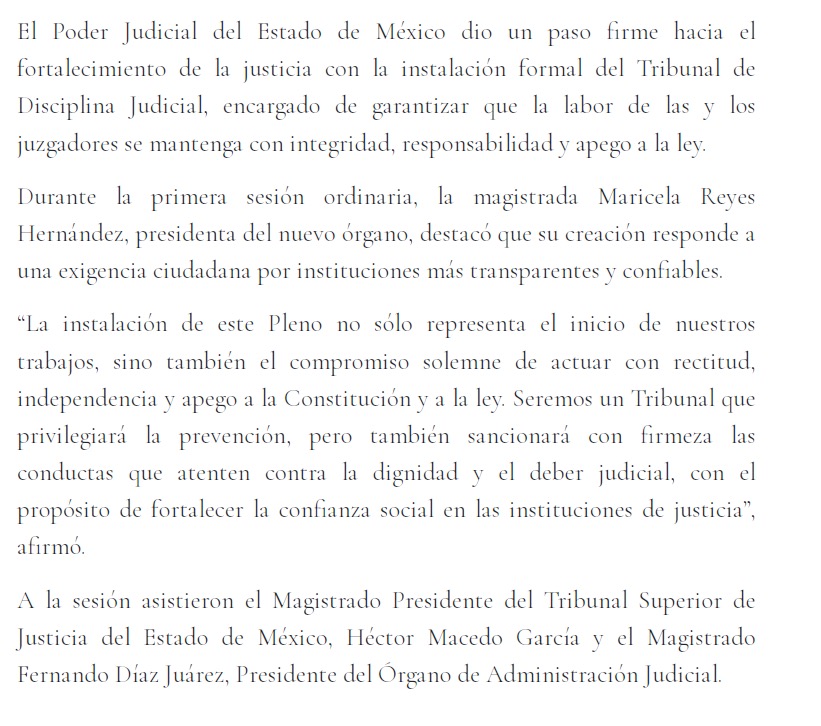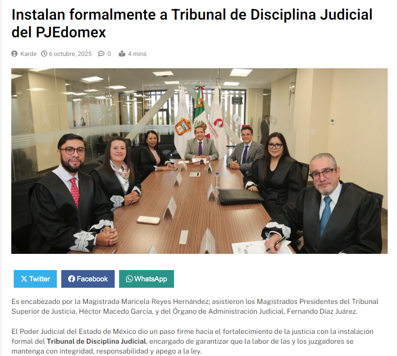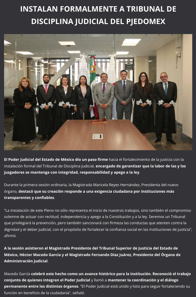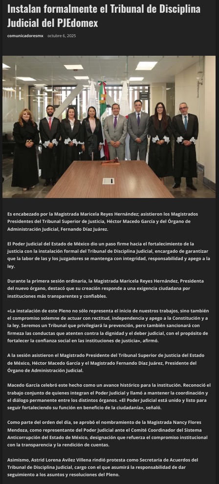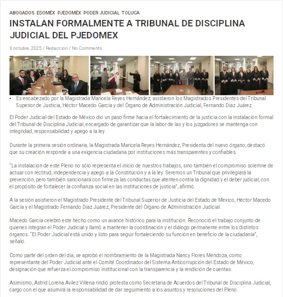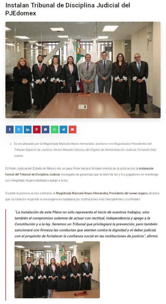 - https://comunicadores.mx/2025/10/06/instalan-formalmente-el-tribunal-de-disciplina-judicial-del-pjedomex/?fbclid=IwY2xjawNR7UJleHRuA2FlbQIxMQBicmlkETFKWkp1UzV2VkNOa2FNR282AR58-6IxU204WDrXsCG9zIPlXowtn8PyGOVwnq_kEKd_9Xs7KB1gxNPT57zgtQ_aem_oJSJ1OM9nyltVqScE05xKg