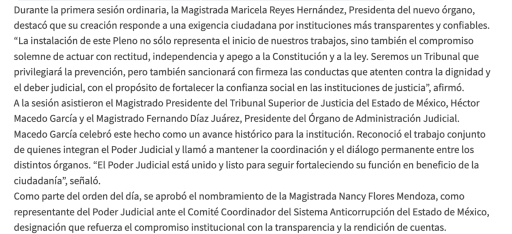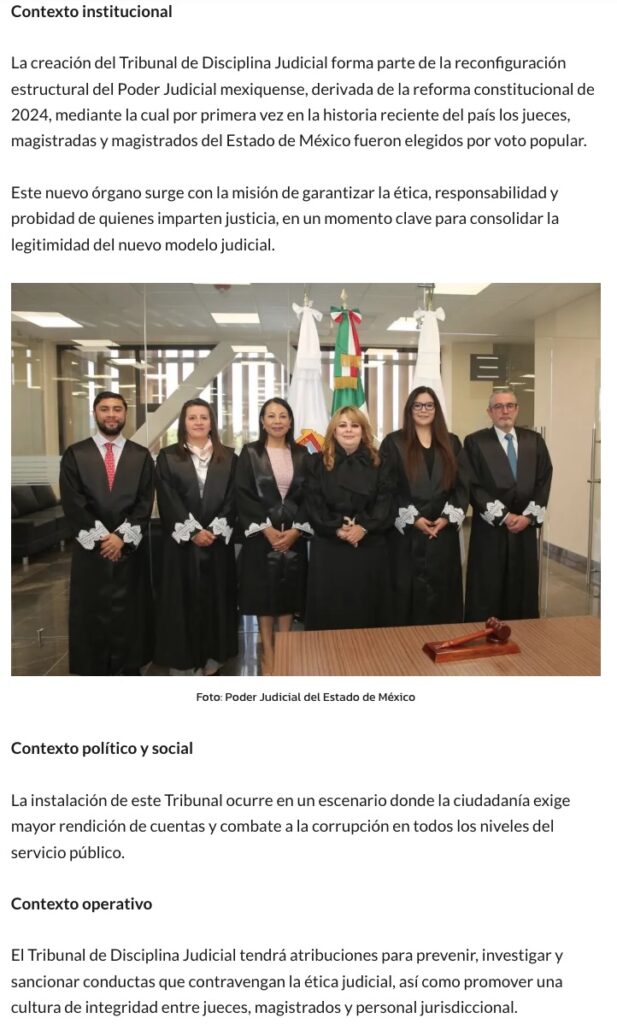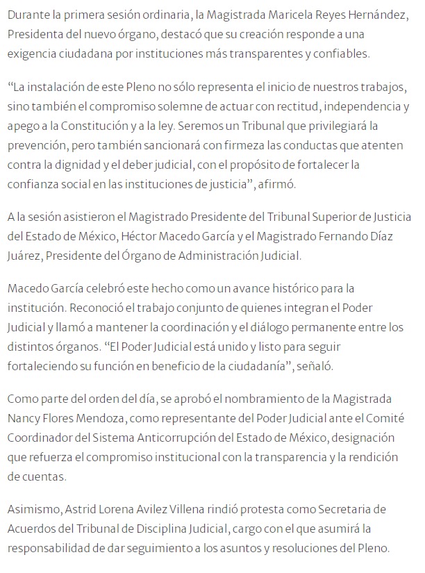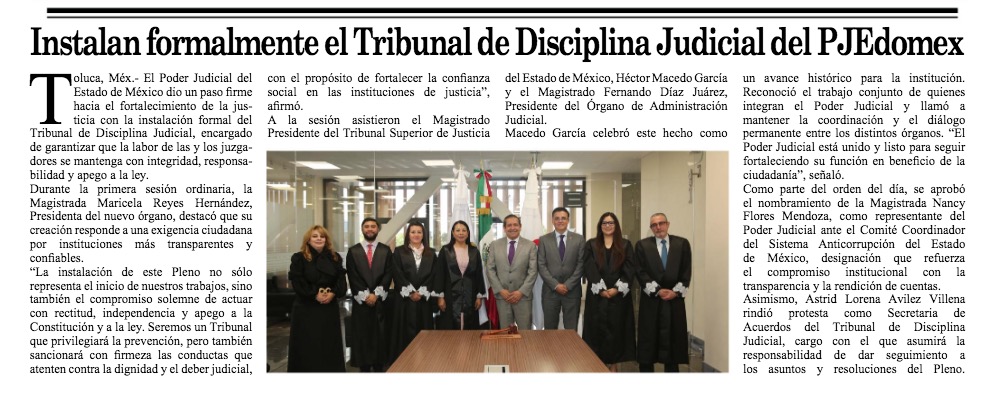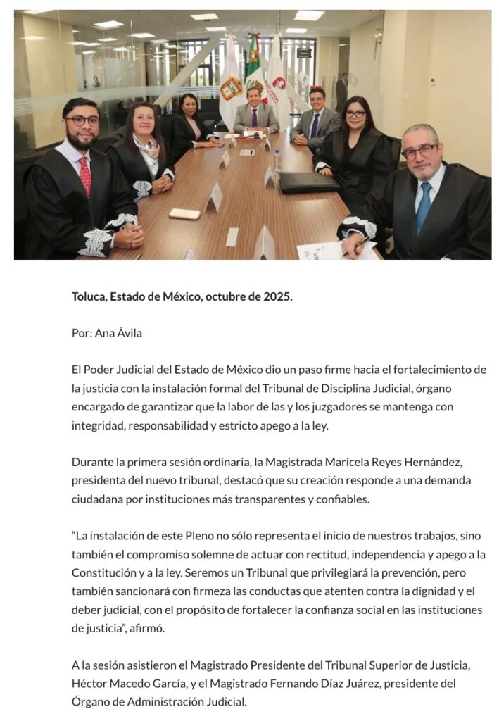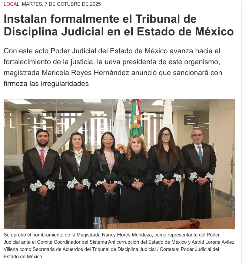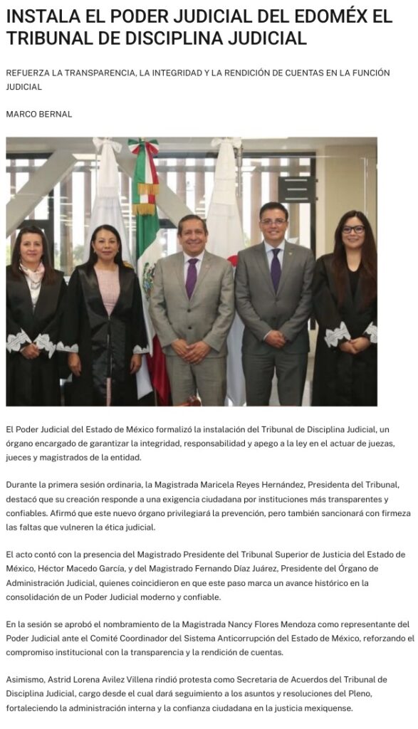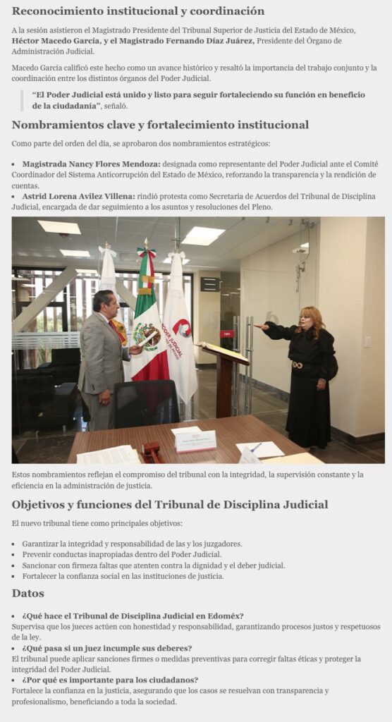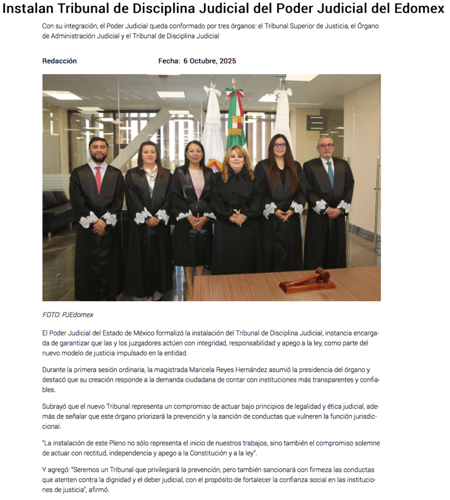 - https://edomexahora.com/2025/10/06/instalan-el-tribunal-de-disciplina-judicial-del-edomex-nuevo-organo-para-fortalecer-la-transparencia-y-la-etica-judicial/